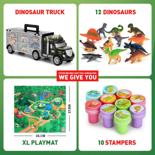 Camión transportador de dinosaurios con 12 figuras de acción de juguete de dinosaurios con tapete de juego XL