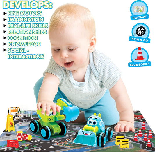 4 camiones de fricción con accesorios | Juguetes para empujar y llevar para niños y niñas