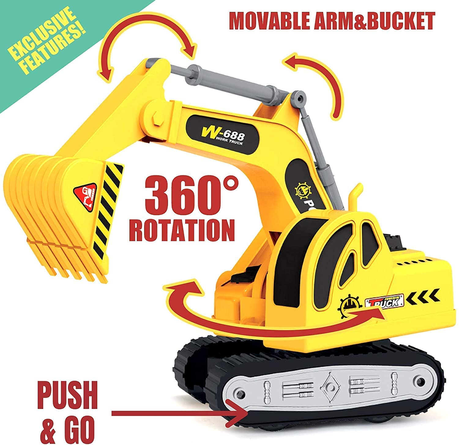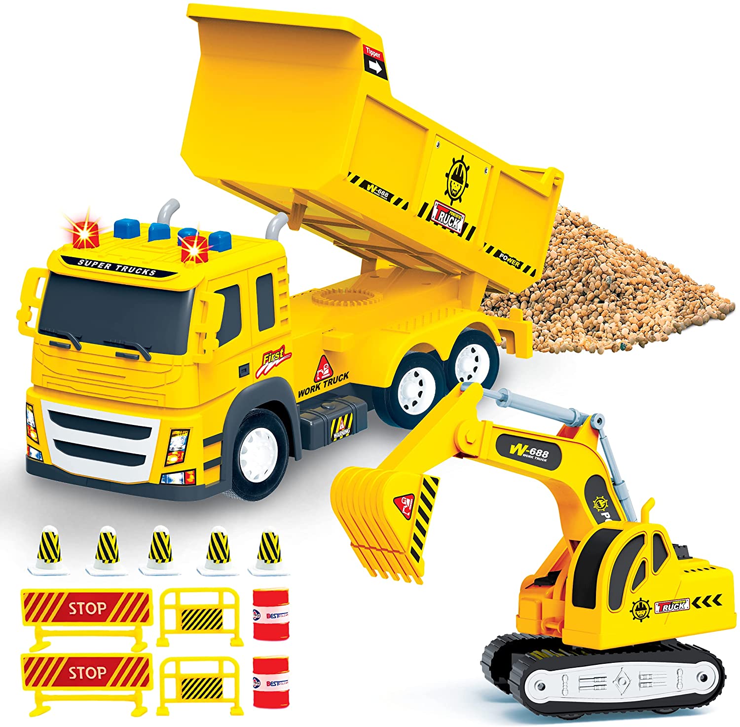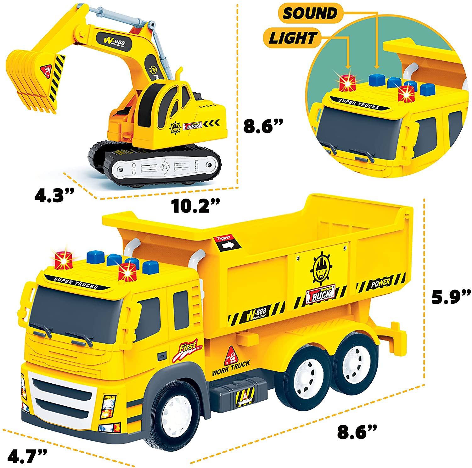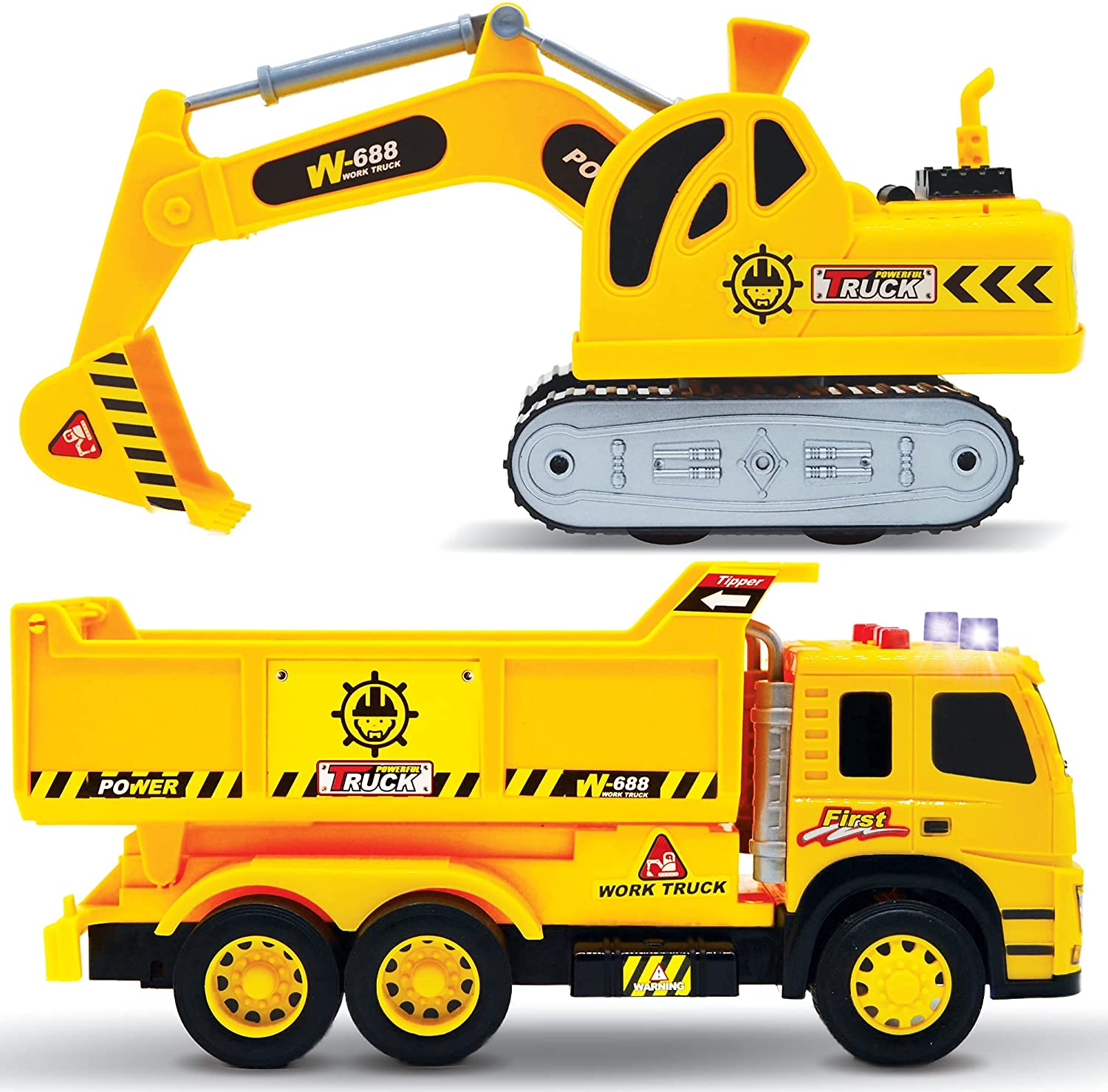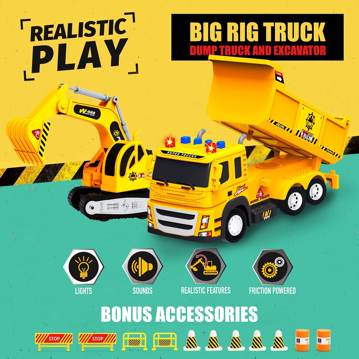 LA ALEGRÍA DE JUGAR CON SONIDOS Y LUCES – INCLUYE PILAS: Experimente la alegría de ver cómo se ilumina la cara de sus hijos cuando presionan los botones del camión y este cobra vida con luces y sonidos que llenan la habitación y el corazón de alegría. Con luces brillantes y una variedad de sonidos, como el arranque del automóvil, la bocina y la sirena, el juego de vehículos de construcción realistas para niños es el juguete con el que no dejarán de jugar. El juego de excavadora y camión volquete le brinda a su hijo la mejor experiencia estimulante