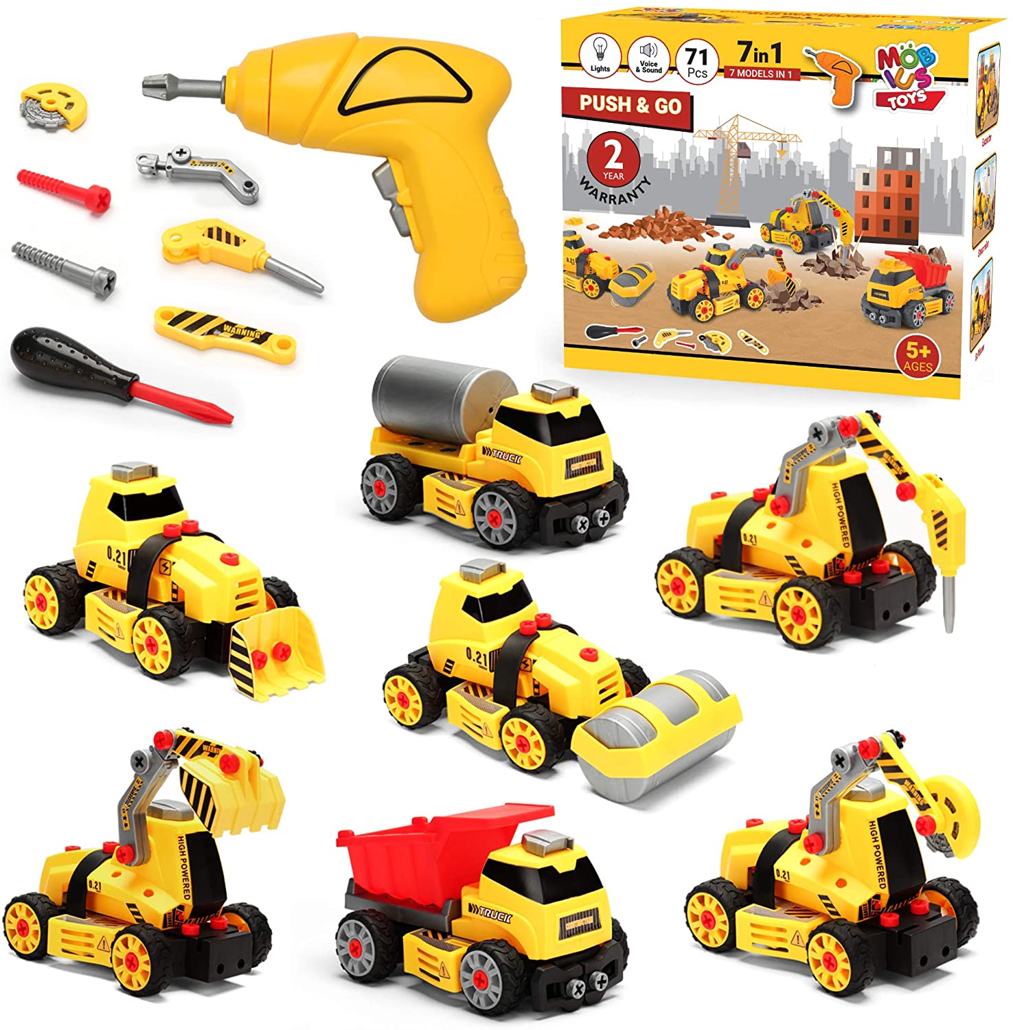 100 % GARANTÍA DE DEVOLUCIÓN DE DINERO, 100 % DIVERSIÓN: Haremos todo lo posible para que estés encantado con tu compra. Nuestros exclusivos camiones desmontables 7 en 1 incluyen 71 piezas con luces y sonidos (pilas incluidas). Construye 7 camiones push & go diferentes y 1 taladro eléctrico (pilas no incluidas). Como estamos tan seguros de la calidad de nuestros juguetes, ofrecemos una GARANTÍA DE DEVOLUCIÓN DE DINERO DE 30 DÍAS SIN RIESGO y una GARANTÍA DEL FABRICANTE DE 2 AÑOS