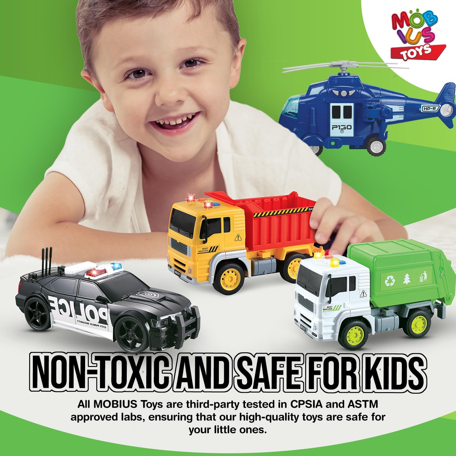 - REGALO PERFECTO PARA LOS AMANTES DE LOS VEHÍCULOS: Ya sea que a tu hijo le gusten los autos o los camiones de juguete, este set es el regalo perfecto para que los niños exploren su imaginación. Con camiones para niños como el auto de policía y el camión volquete, además de un helicóptero de juguete y un camión de basura de juguete, este set es ideal para los niños que disfrutan jugando con autos de juguete para niños pequeños. Es versátil y duradero y fomenta el juego independiente y en grupo.