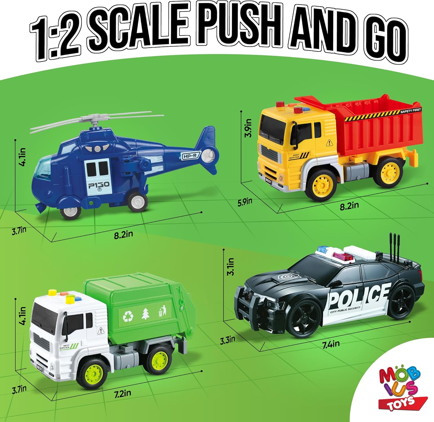 - INCLUYE 4 VEHÍCULOS DURADEROS PARA AVENTURAS EN LA CIUDAD: Este juego de empujar y llevar viene con cuatro vehículos duraderos: un coche de policía, un camión de basura de juguete, un camión de basura de juguete y un camión volquete de construcción. Cada vehículo está diseñado con detalles realistas, lo que lo hace perfecto para el juego creativo. Los niños pueden limpiar la ciudad, hacer cumplir la ley, construir sitios de construcción y volar alto con el helicóptero.