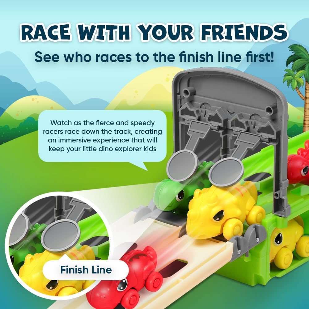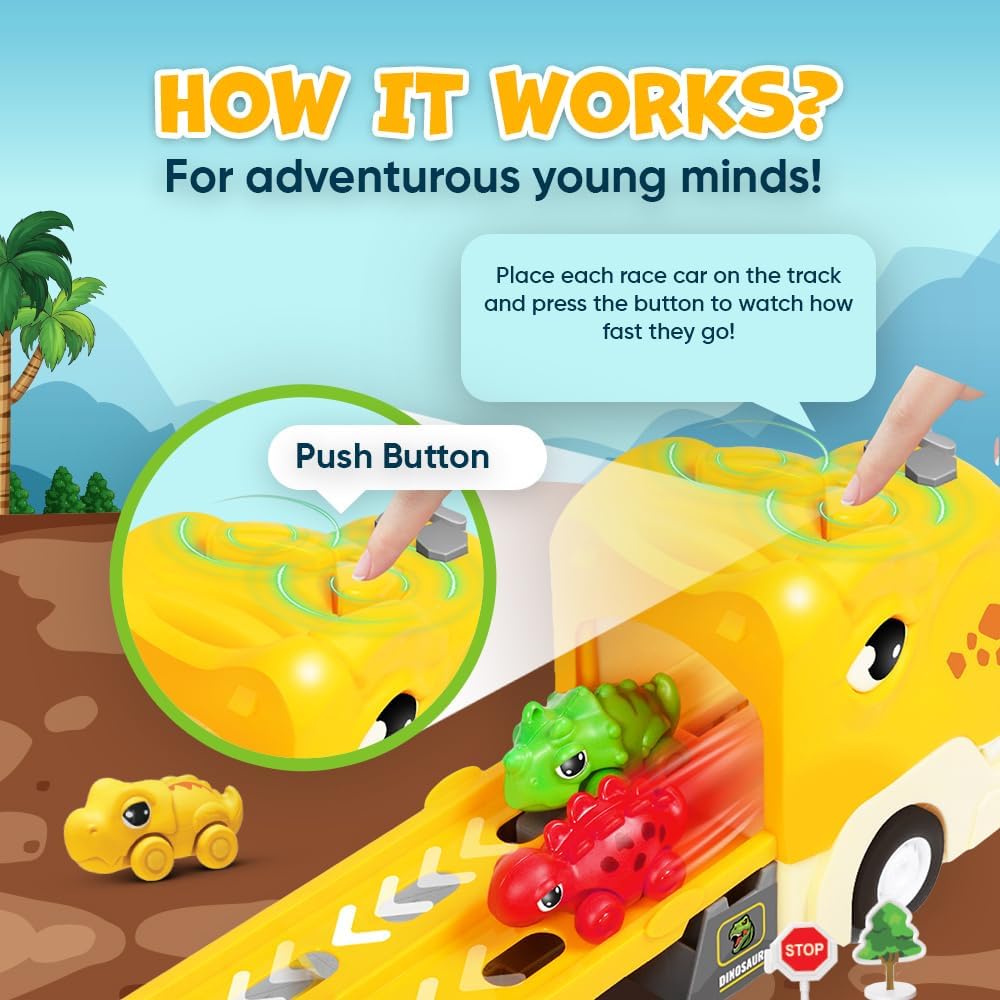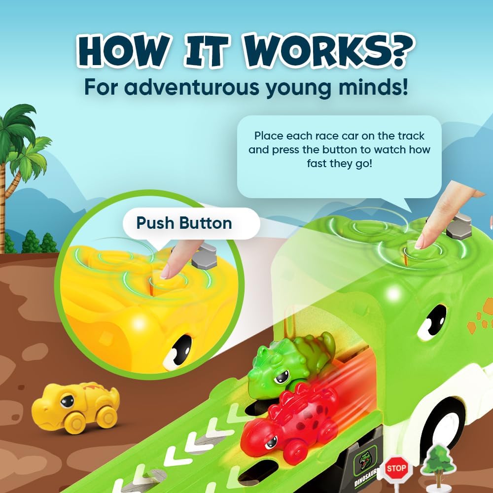 - IDEA DE REGALO PERFECTA: ¡Que comiencen las carreras con solo presionar un botón! Observa la DIVERSIÓN DE LOS DINOSAURIOS RUGIENDO mientras tus autos de carrera de dinosaurios recorren la pista a toda velocidad, compitiendo por la victoria. Cuando termines de jugar, guarda fácilmente los autos de carrera en el transportador del camión para una limpieza rápida y conveniente. Este versátil camión transportador de dinosaurios está fabricado con materiales plásticos de primera calidad y respaldado por una garantía del fabricante de 2 años, lo que lo convierte en un regalo perfecto para niños de 3 a 7 años.