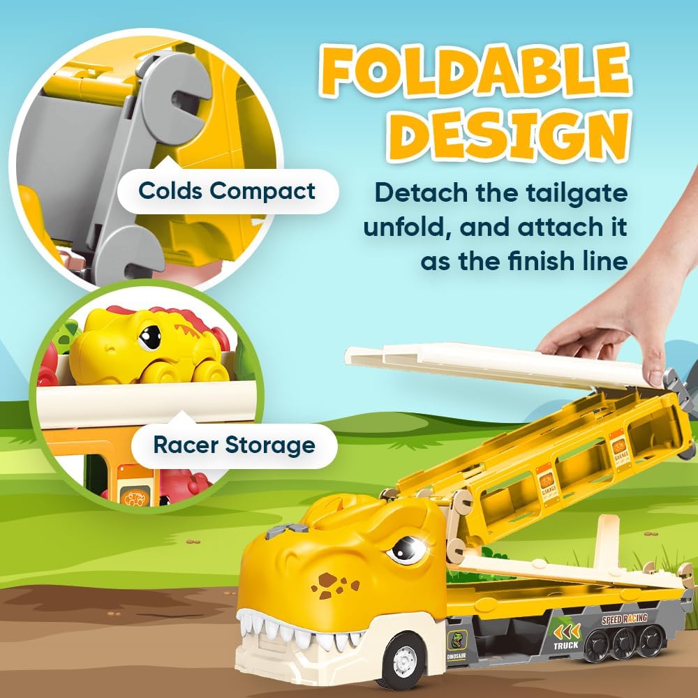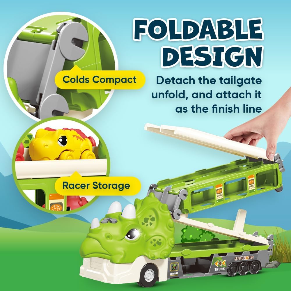 - DESPLIEGUE LA AVENTURA: Este cautivador transportador no solo transporta autos de carrera de dinosaurios, sino que también se transforma en una IMPRESIONANTE pista de carreras de 4 PIES DE LARGO. Simplemente separe la puerta trasera, despliéguela y fíjela como línea de meta. Cargue la diversa variedad de 6 autos de carrera de dinosaurios, que incluyen opciones vibrantes en rojo, verde y amarillo, para carreras emocionantes que fomentan la competencia amistosa y el juego imaginativo.