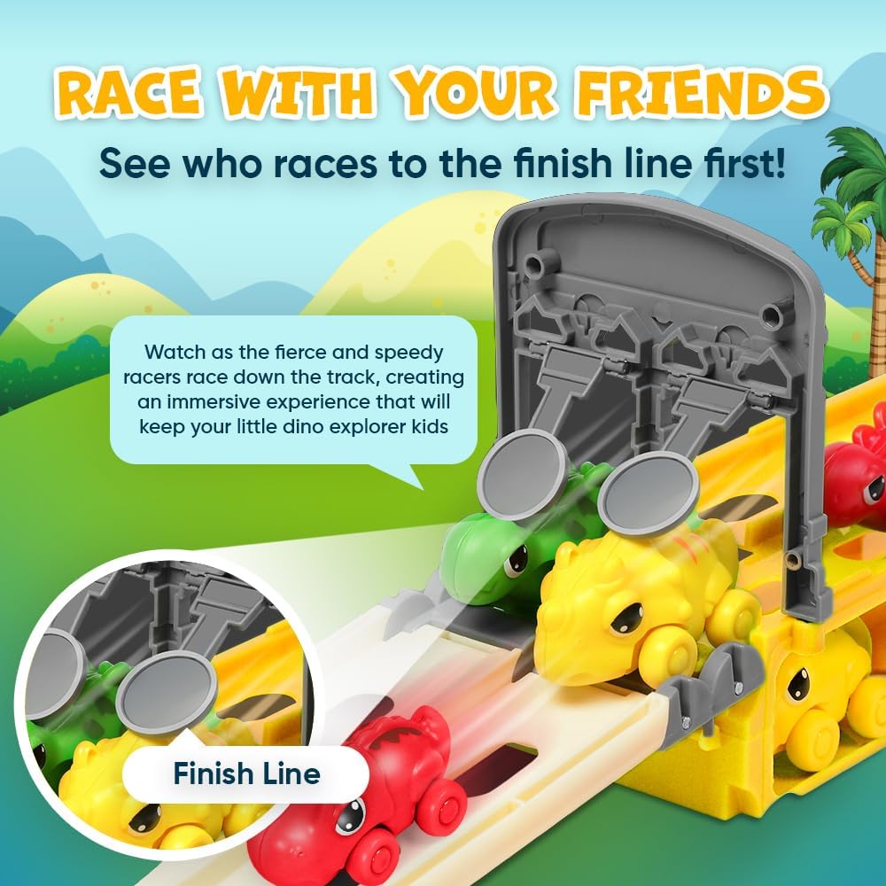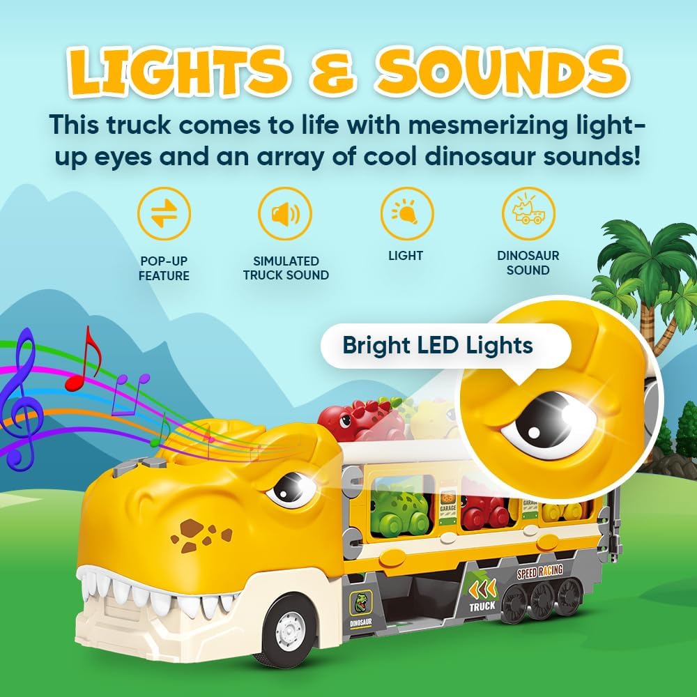 - EMOCIÓN DE CARRERAS DE DINO: ¡Embárcate en una aventura prehistórica con nuestra pista de carreras de camiones de juguete de dinosaurios! El camión transportador cobra vida con ojos luminosos cautivadores y una variedad de sonidos dinámicos. Pero eso no es todo: este increíble transportador no solo transporta autos de carrera de dinosaurios, sino que también se despliega en una pista de carreras de doble carril de 4 pies. Observa cómo los feroces y veloces corredores corren por la pista, creando una experiencia inmersiva que mantendrá a tus pequeños exploradores de dinosaurios emocionados y comprometidos.