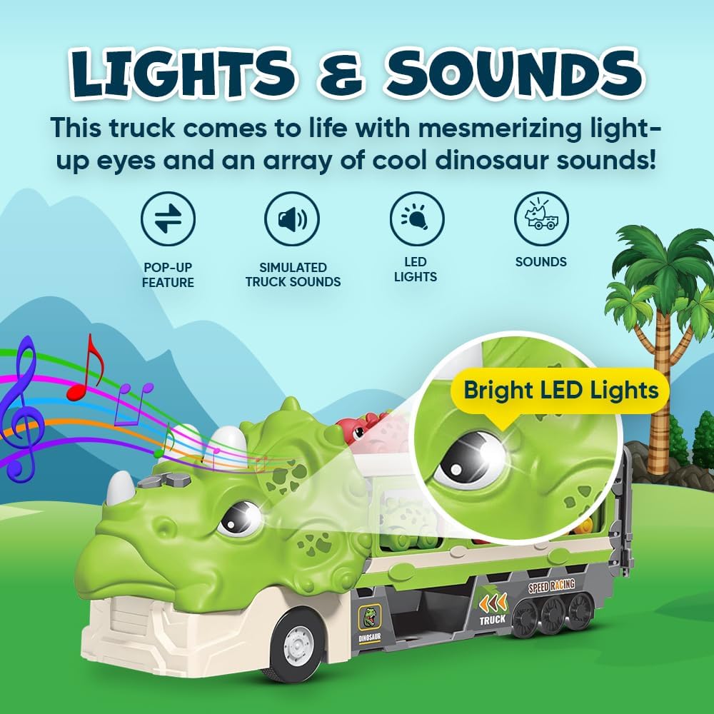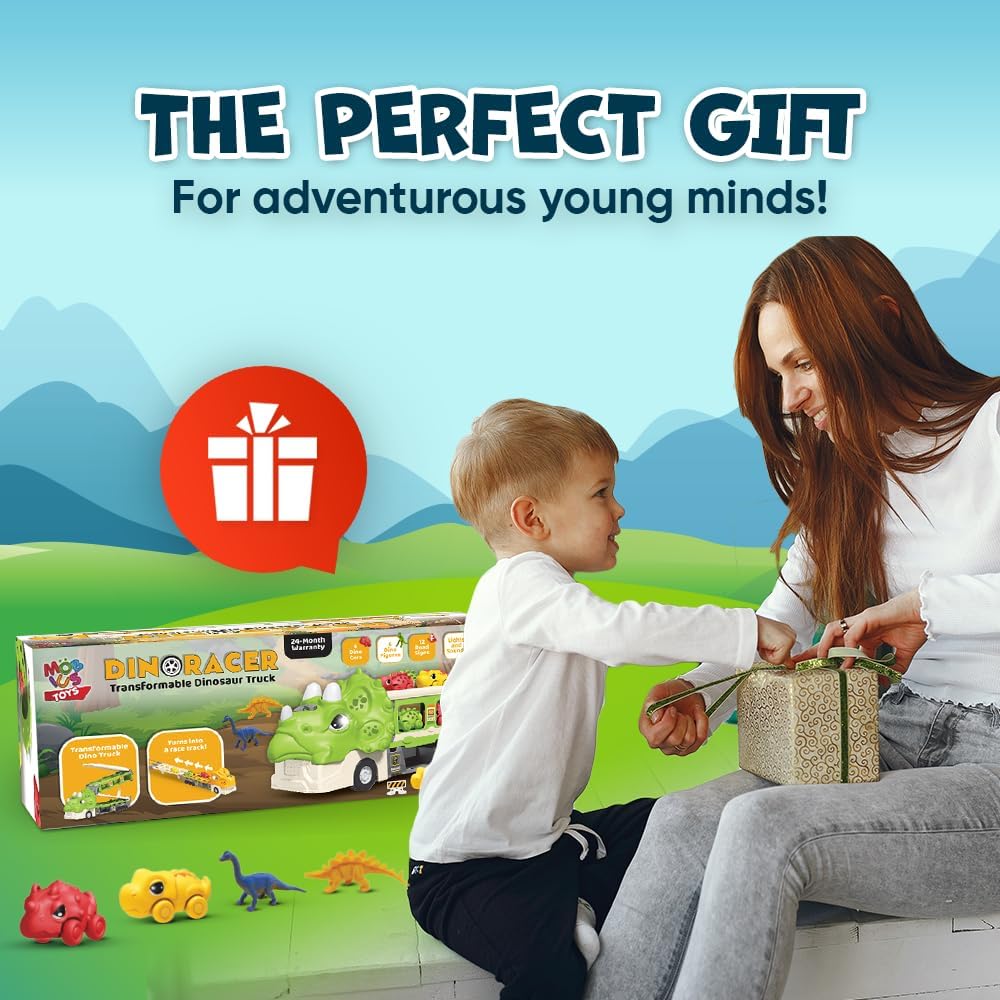 - CORRE, JUEGA Y DA rienda suelta a tu imaginación: despierta las mentes de los más pequeños y embárcate en horas de juego imaginativo con el cautivador Dinosaur Transporter. Ya sea para jugar solo o para competir con amigos, este dinosaurio de juguete para niños de 3 años en adelante fomenta el pensamiento estratégico, las habilidades motoras y la narración creativa. La emocionante combinación de un transportador, una pista de carreras transformable y sonidos dinámicos garantiza un entretenimiento sin fin que mantendrá a los niños interesados y encantados.