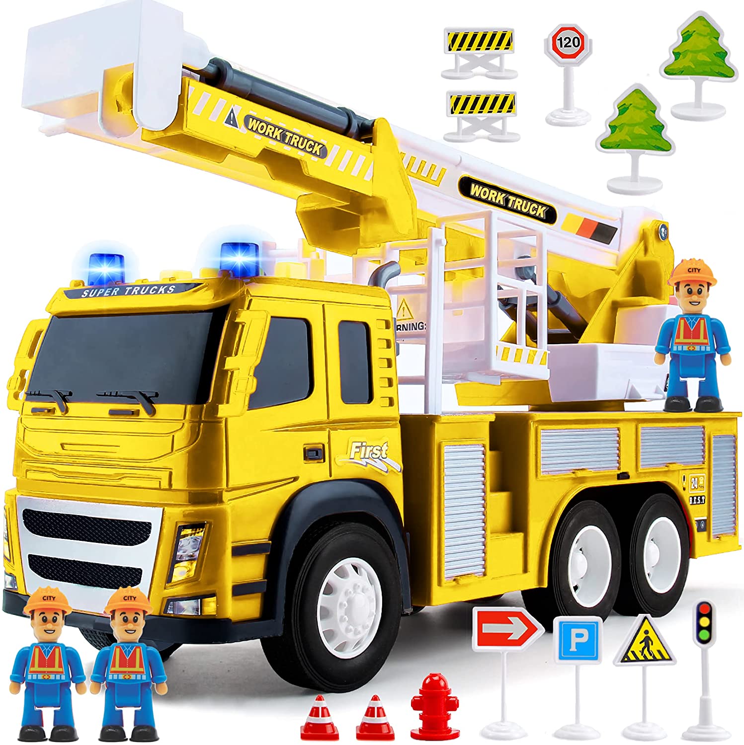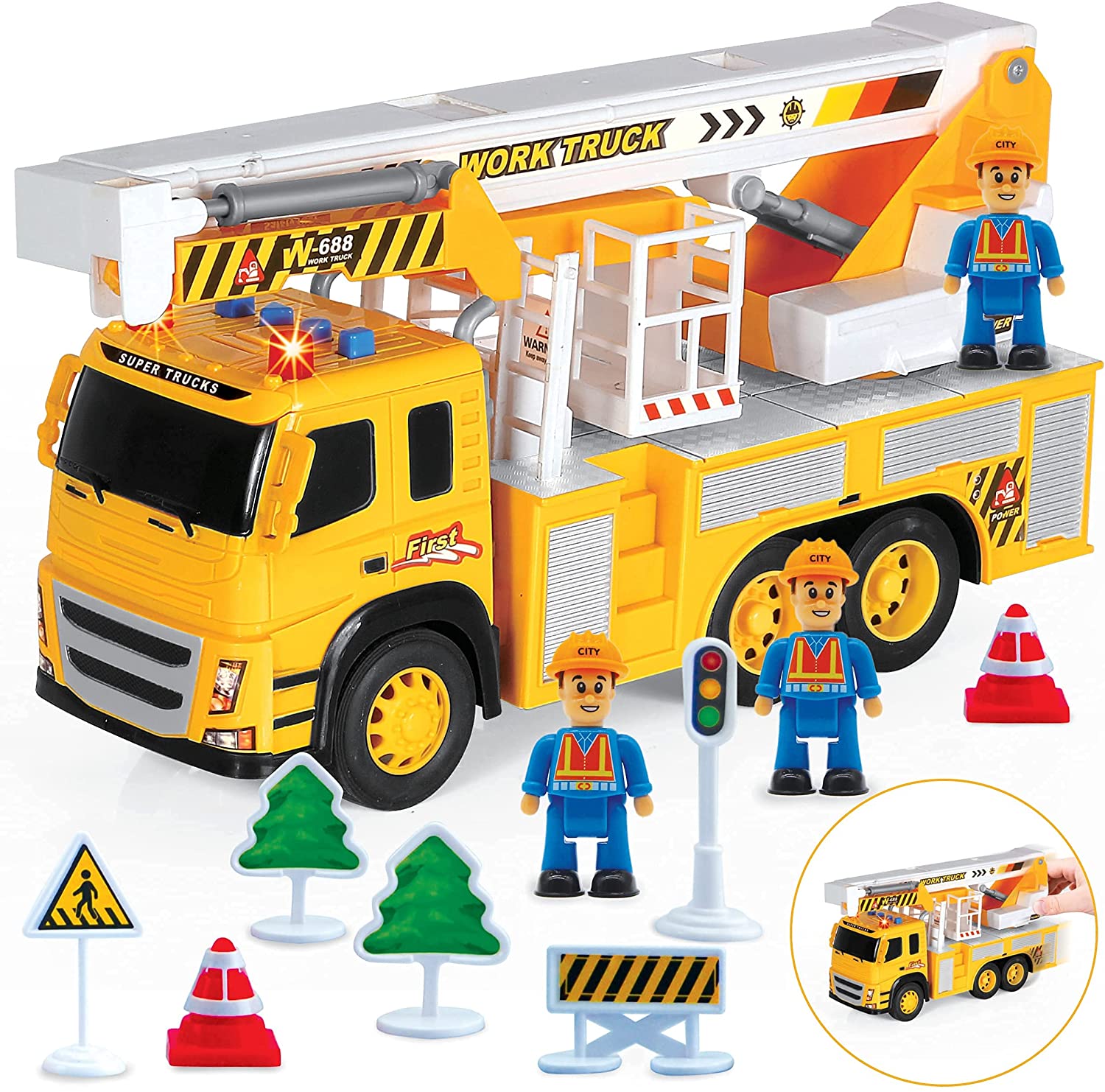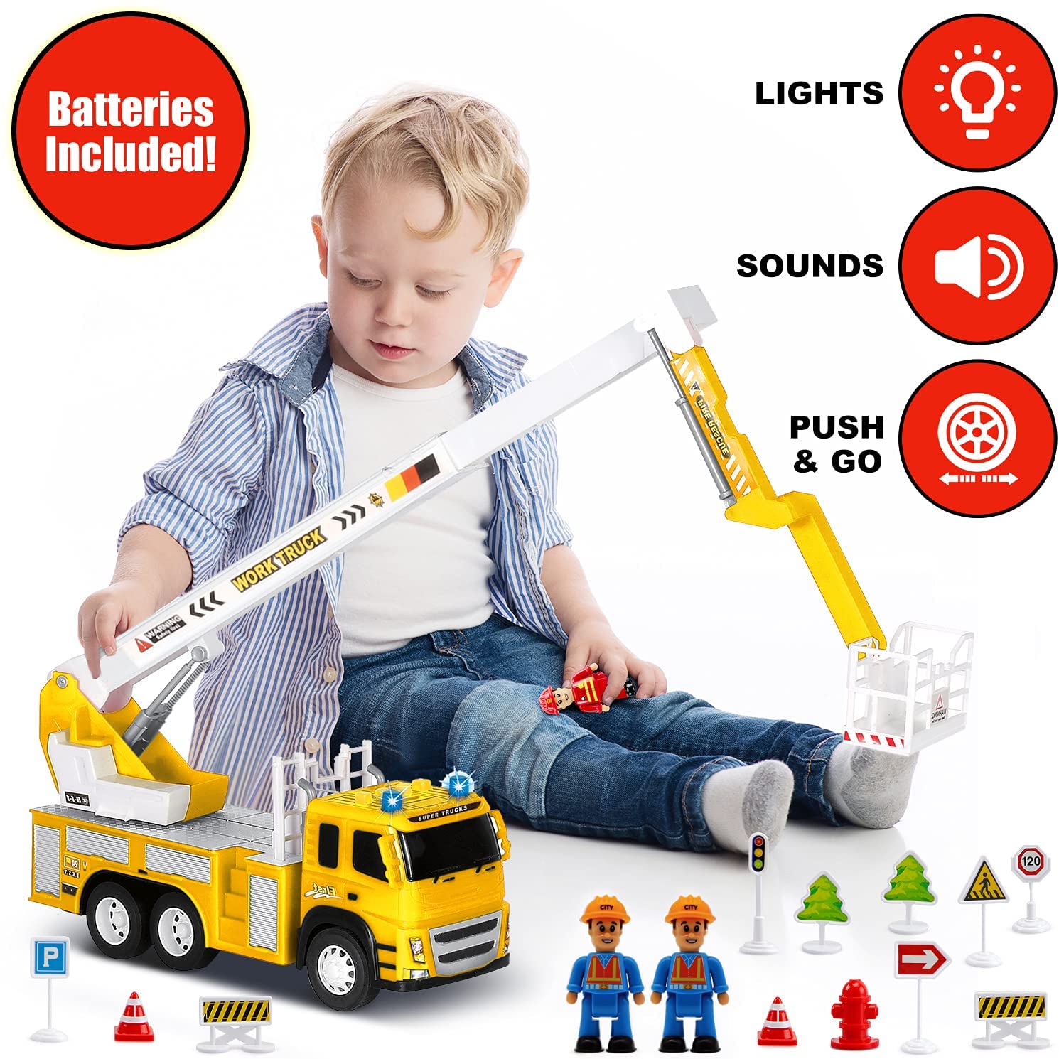EMOCIONANTE EXPERIENCIA DE JUEGO CON PUSH & GO IMPULSO POR FRICCIÓN: Horas de emocionante diversión con todas las opciones que este Camión Utilitario de Construcción tiene para ofrecer a sus hijos: con una escalera extensible funcional + balde en la parte superior, 3 TRABAJADORES DE LA CIUDAD que su hijo puede mover y hacer que interactúen con el Camión Utilitario de Juguete, y muchos más accesorios para crear el mejor entorno de juego: 2 conos, hidrante, barreras de seguridad, 2 árboles, semáforos y una variedad de señales de tránsito