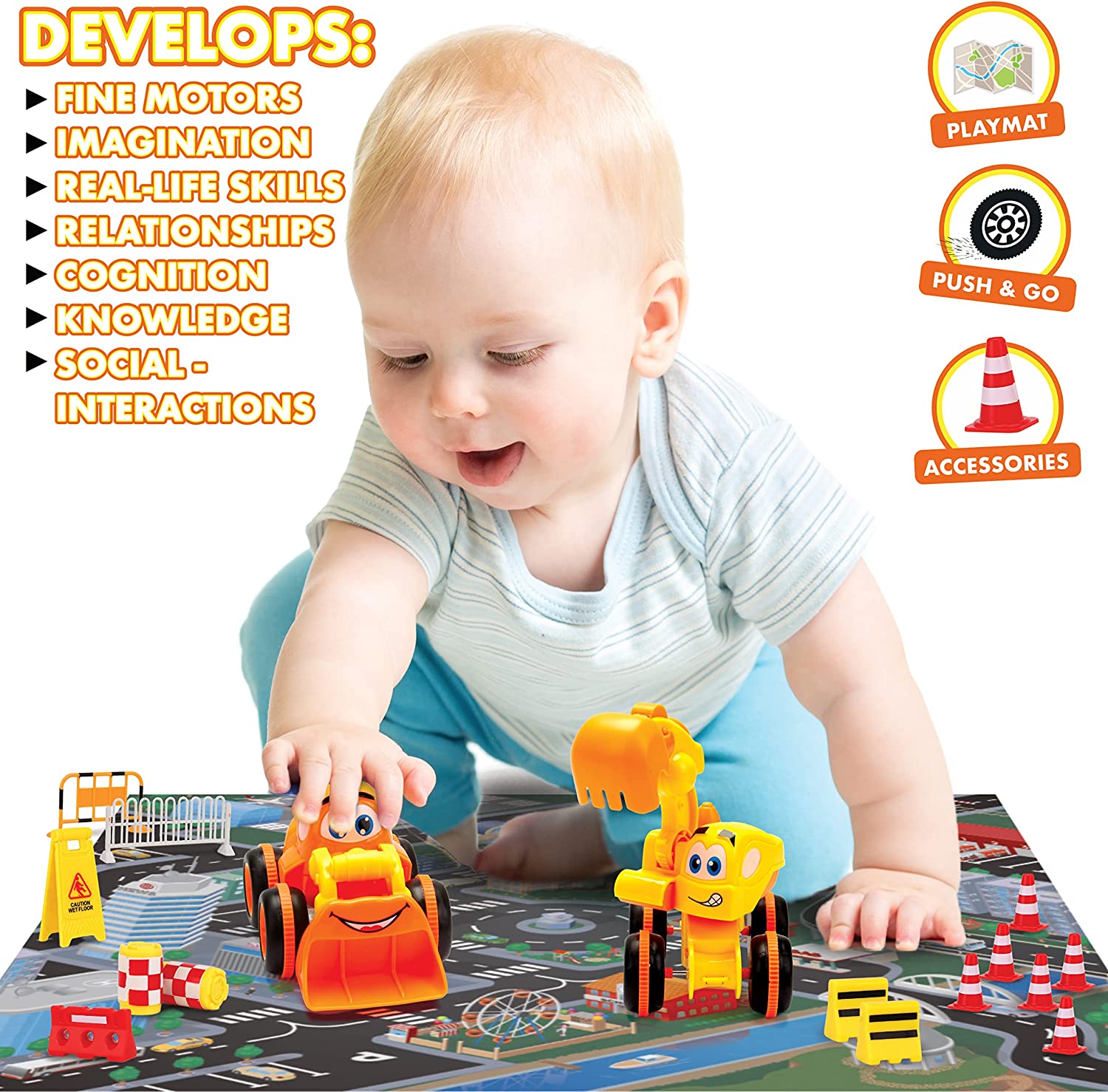 ЗАХВАТЫВАЮЩИЕ ФУНКЦИИ с 16 АКСЕССУАРАМИ: Инженерные машины с фрикционным приводом — это отличные развивающие грузовики для мальчиков в возрасте от 2 до 3 лет и старше. Каждая мультяшная машина имеет движущиеся части, что побуждает малышей продолжать играть. С 16 аксессуарами игра очень обогащает воображение, так как ваш ребенок создает мир, размещая на игровом коврике различные знаки, конусы и барьеры. Дети узнают о строительных грузовиках и разовьют мелкую моторику, когда будут тянуть и толкать машины