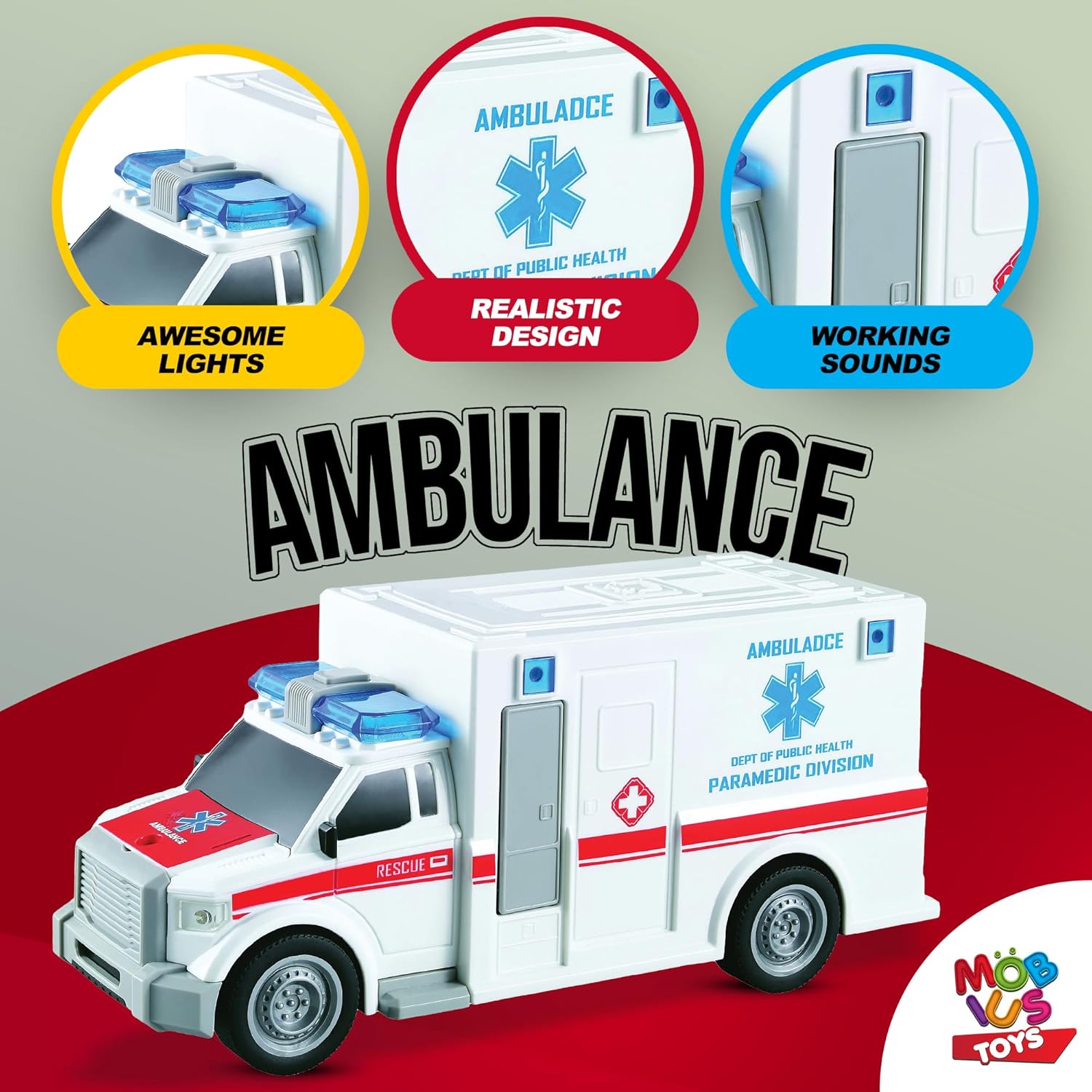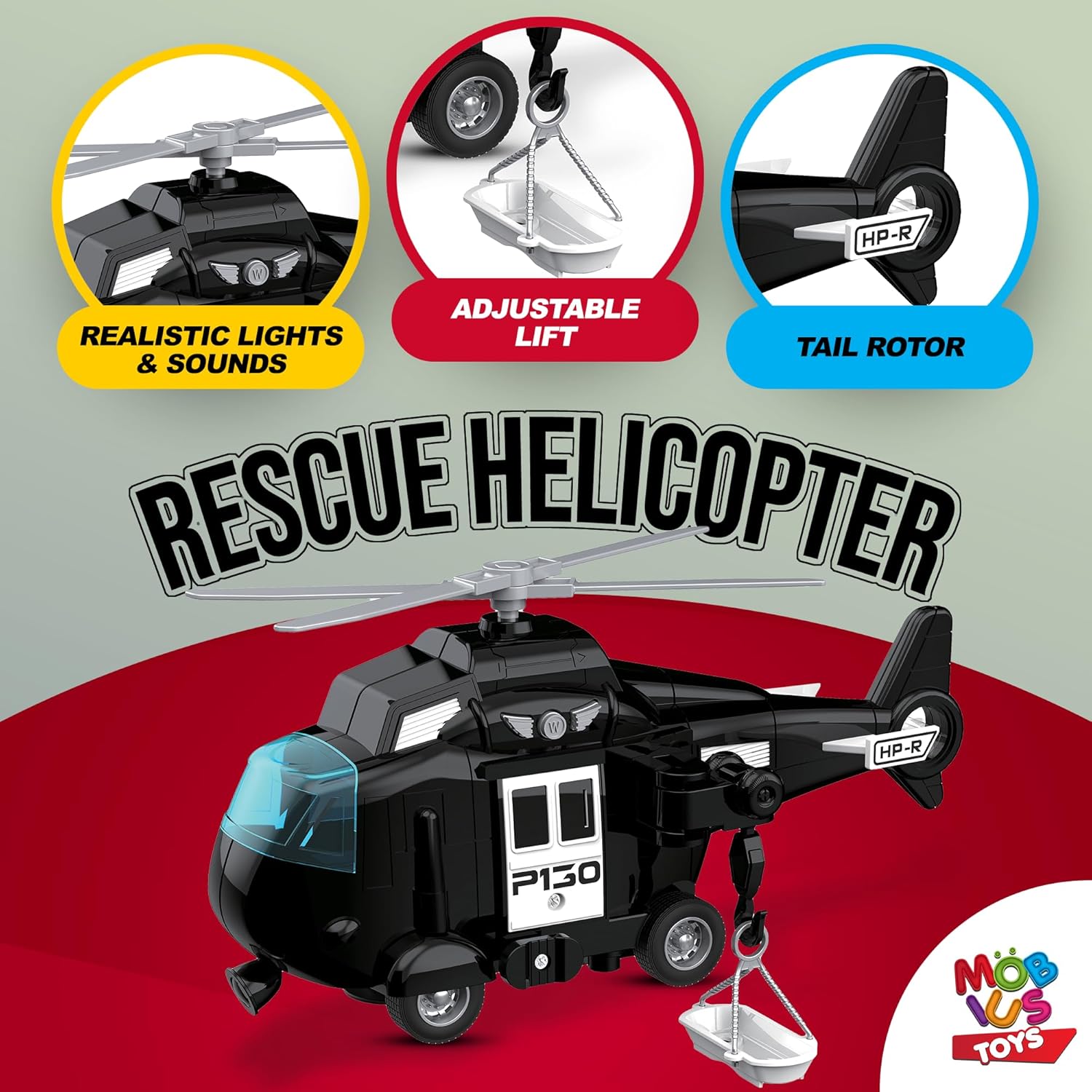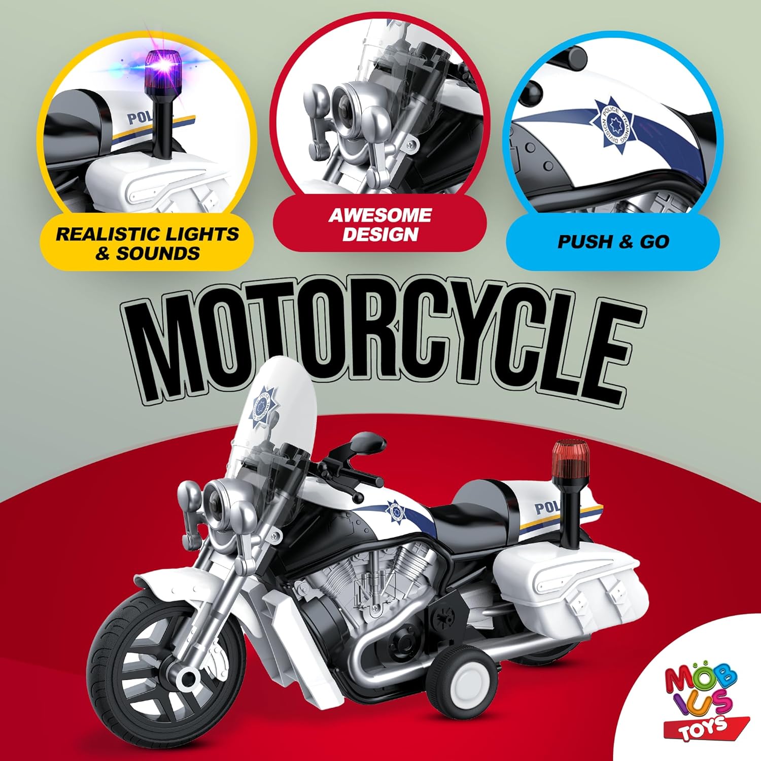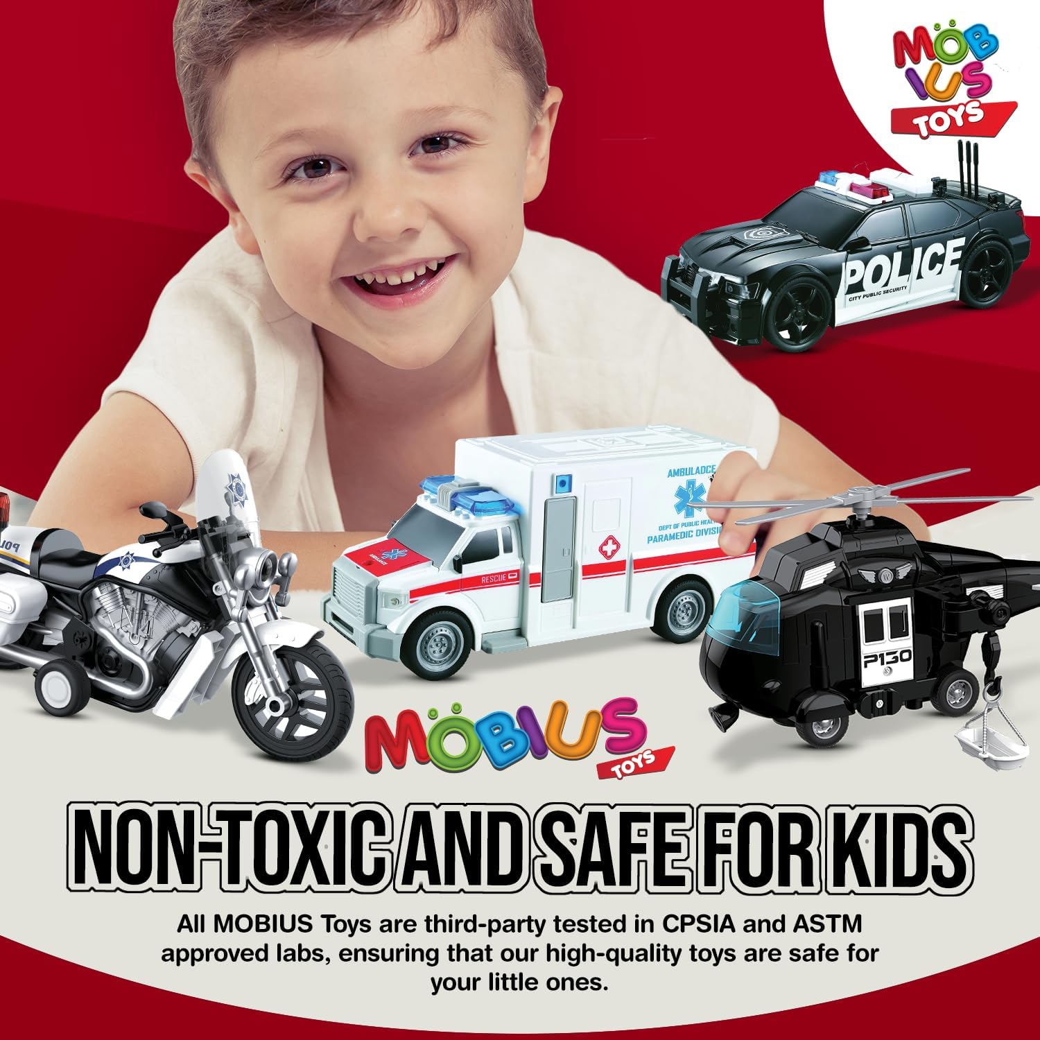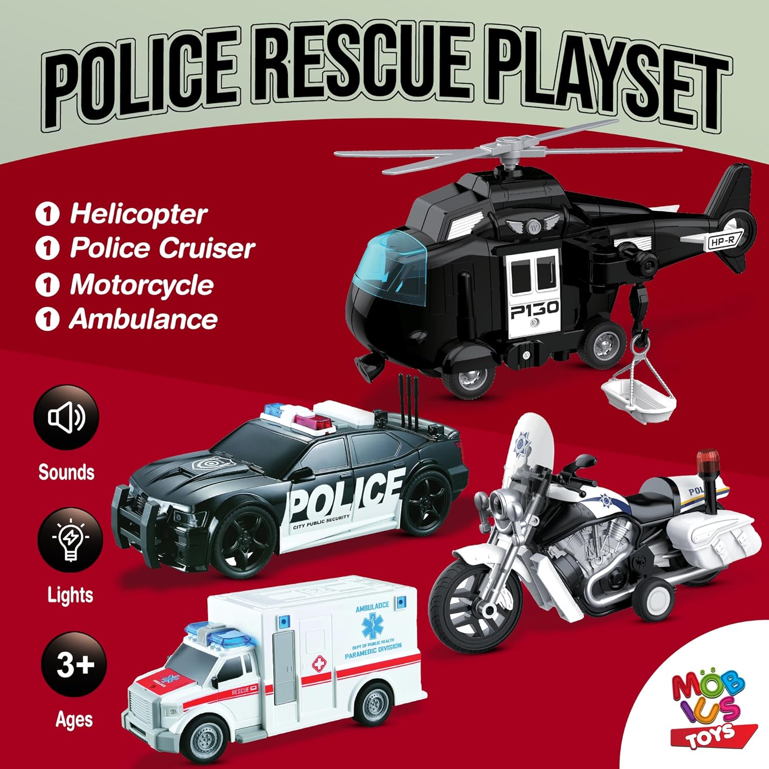 - COMPLETE EMERGENCY RESPONSE TEAM – This Playset of 4 Police Vehicles includes everything your little one needs for endless hours of imaginative play. Featuring a police car, helicopter, motorcycle, and toy ambulance, this set is designed to spark creativity and excitement. With realistic flashing lights and sounds, your child will feel like they're part of the action, making it one of the best police toys for boys 4-6 and an exciting addition to their toy collection.